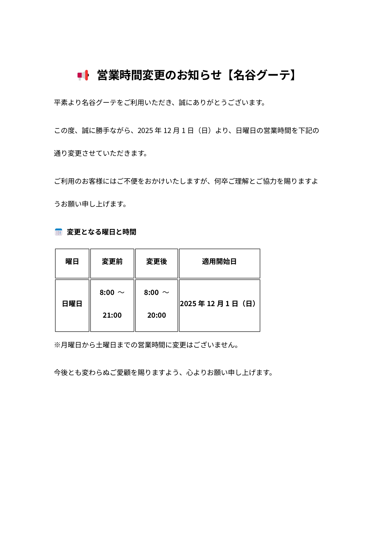 2025/11/18営業時間変更のお知らせ【名谷グーテ】